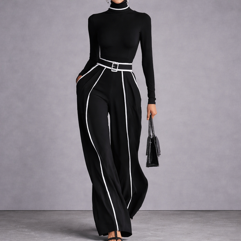 The Lureno Elite Contrast is the definition of modern urban elegance. This two-piece set was created for the woman who needs to look professional without ever compromising on comfort. The combination of a precision-tailored top with signature contrast piping and fluid wide-leg trousers creates a harmonious look that radiates confidence, poise, and refined taste.